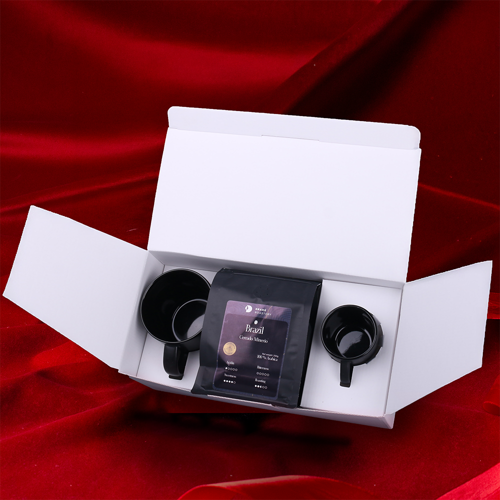 One of the top sales hits – the black matte Handy Supreme mug accompanied by its smaller version, Small, perfect for espresso, and carefully selected Arabica Brazil Cerrado Mineiro coffee beans 250g. The set is packed in dedicated eco-friendly Merry packaging and finished with an elegant personalized band. THE PRESENTED DECORATION IS FOR ILLUSTRATION PURPOSES ONLY AND IS NOT INCLUDED IN THE PRODUCT PRICE. THE SET IS AVAILABLE IN DEDICATED MERRY PACKAGING WITH A SELECTED DECORATION OPTION.