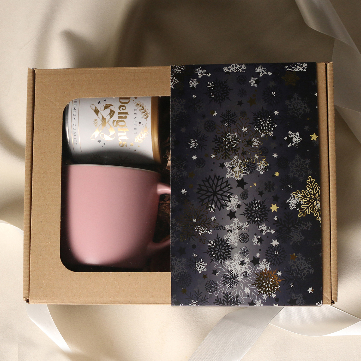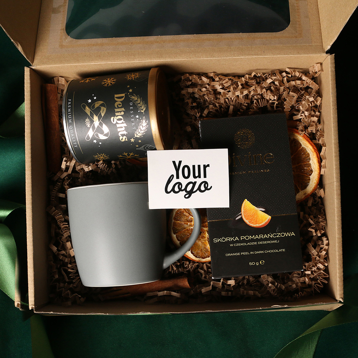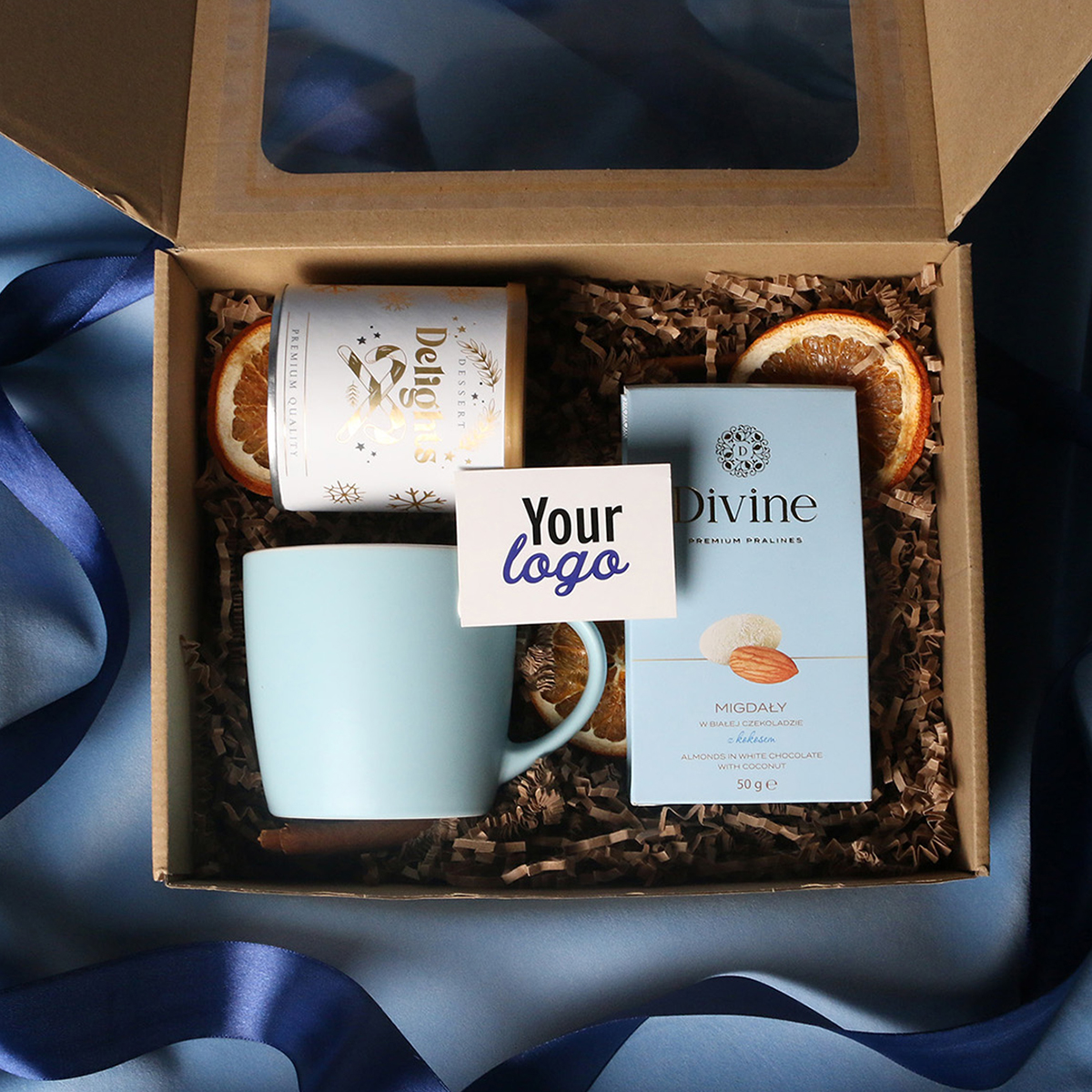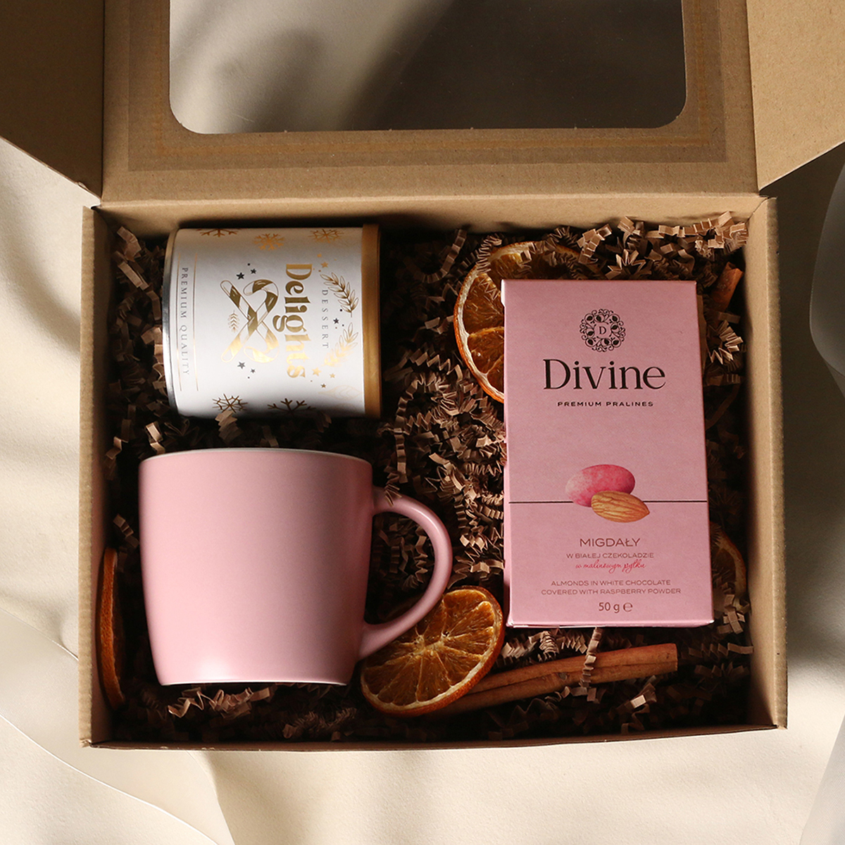The set includes: Handy Velvet mug rose pink-white / baby blue-white / Handy Cool gray-white with the option of customization, Divine Pralines – almonds in chocolate with raspberry powder (pink) / almonds in chocolate with coconut (blue) / orange peel in dark chocolate (gray), Dessert Delights – blackcurrants in white chocolate with raspberry powder packed in a tube with a winter theme. All packed in a stylish eco cardboard box with a window. Additional customization options: print on the mug, company logo tag, ribbon or sleeve with a winter theme enriched with gold stamping.